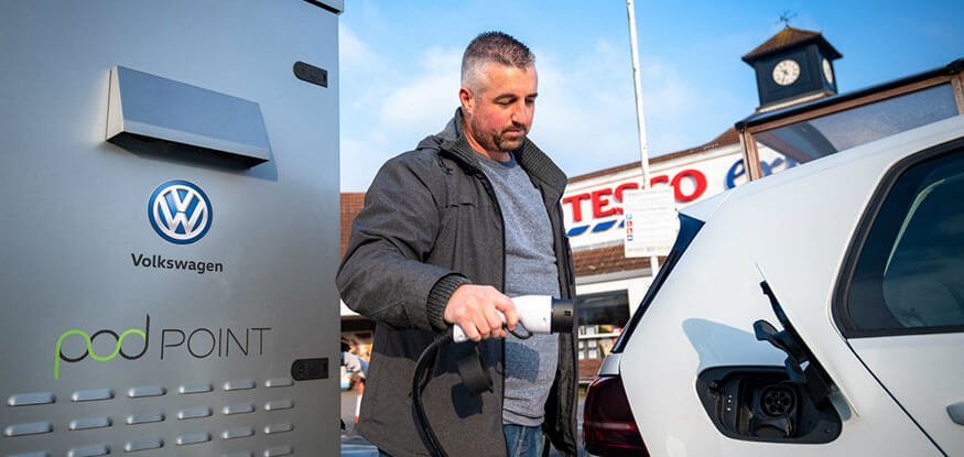 The largest retail network of electric vehicle (EV) chargers will be rolled out across 600 Tesco stores in the UK within the next three years, it has been announced. The British supermarket has partnered with Volkswagen to provide a charging network that will comprise of 2,400 EV charging bays, and will be installed by UK-based independent public operator, Pod Point. Customers will be able to charge their electric cars using a standard 7kW fast charger for free or benefit from the use of a rapid 50 kW charger for a small cost in line with the market rate.